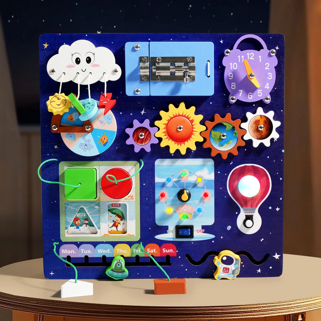 Multi-Activity Design: Features multiple activities in one board, including a Latch Lock, Gear Game, Digital Clock, Weather wheel, Drawstring game, Button light, Main switch, Astronauts moving, and Rotating colored lights.